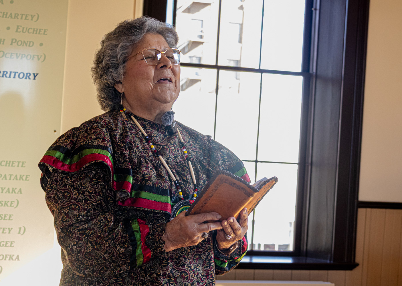 It began with a simple challenge. Her Muscogee language teacher, Don Tiger, asked her to learn a hymn and return the following week to sing it in front of the class. She had not been raised in a household where the language was spoken fluently, but she found a recording online, taught herself the words and stood up the next week to sing.